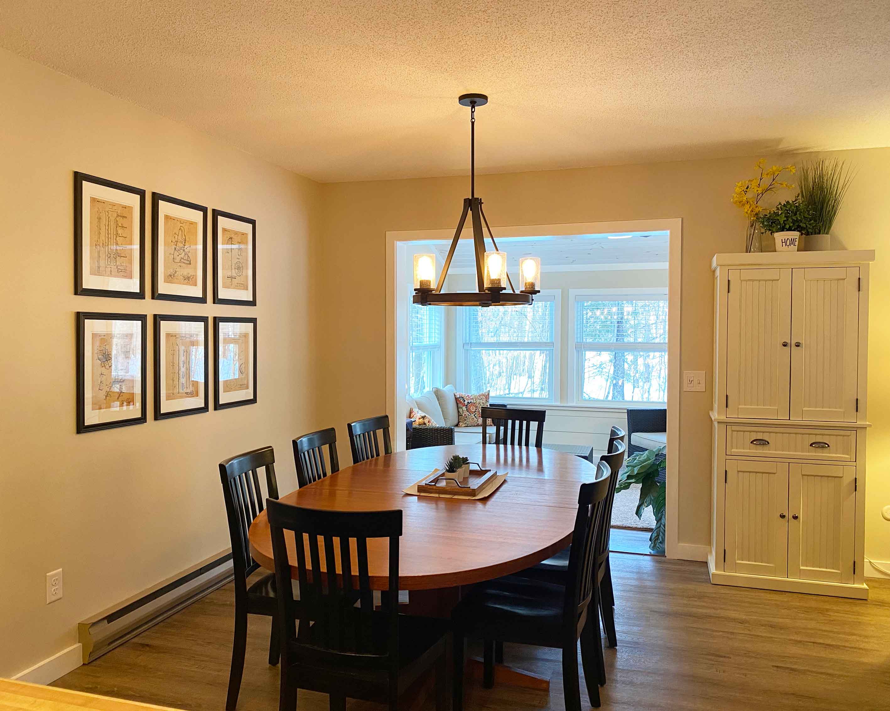 Open living space including sun room and basement playroom.